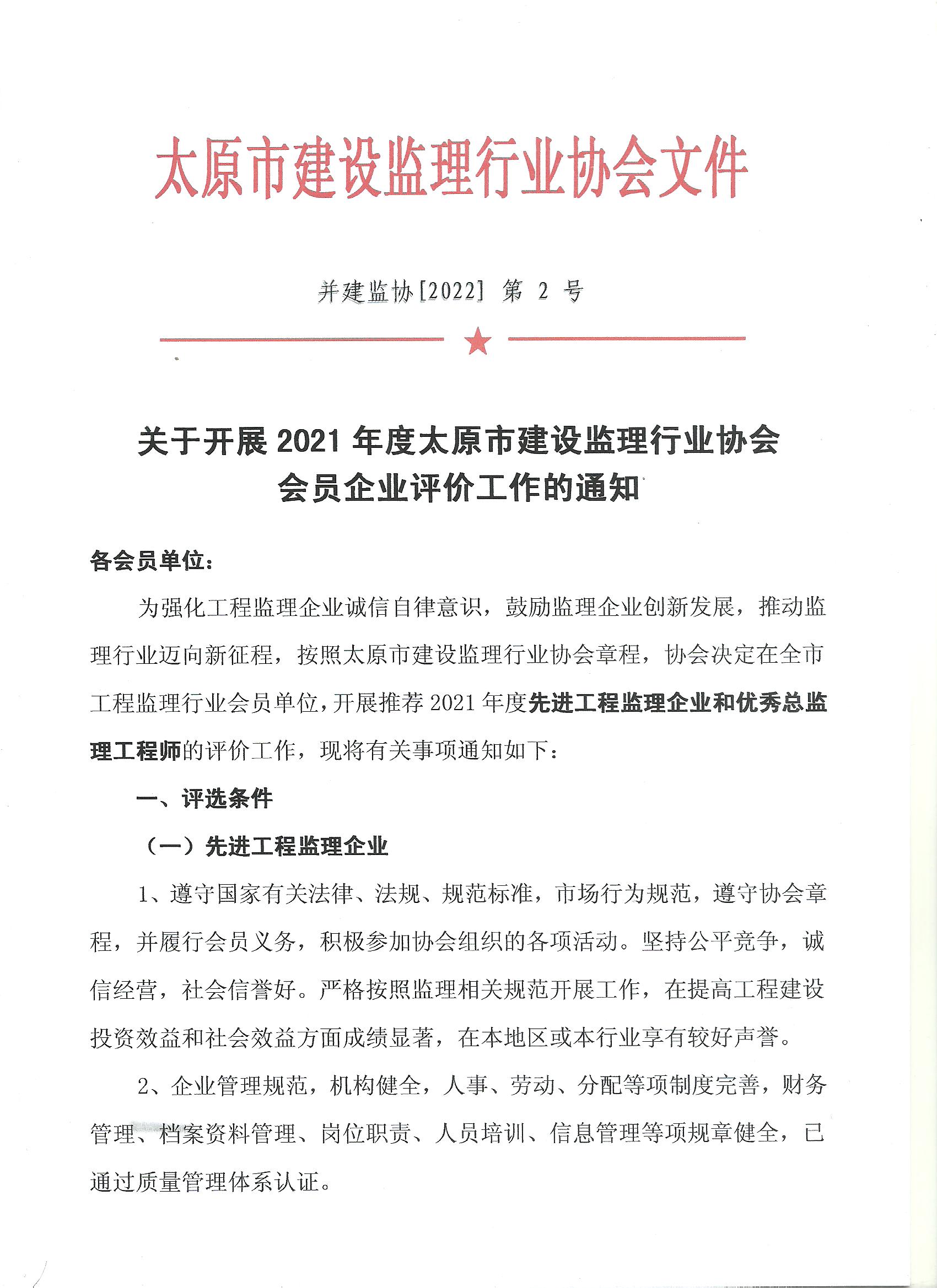 关于开展2021年度太原市建设监理行业协会会员企业评价工作的通知