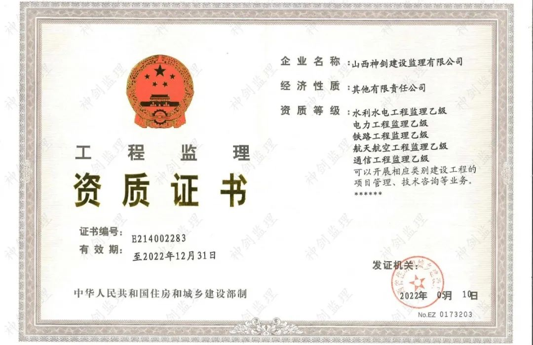 目前,山西神剑建设监理有限公司拥有房屋建筑工程监理甲级、化工石油工程监理甲级、市政公用工程监理甲级、机电安装工程监理甲级、电力工程监理乙级、航天航空工程监理乙级、通信工程监理乙级、水利水电工程监理乙级、人防工程监理乙级资质、环境监理备案证书等多项资质证书,并通过了质量、环境、职业健康安全三大ISO管理体系认证。除承接建设监理业务以外,还可以向客户提供工程造价咨询等服务。